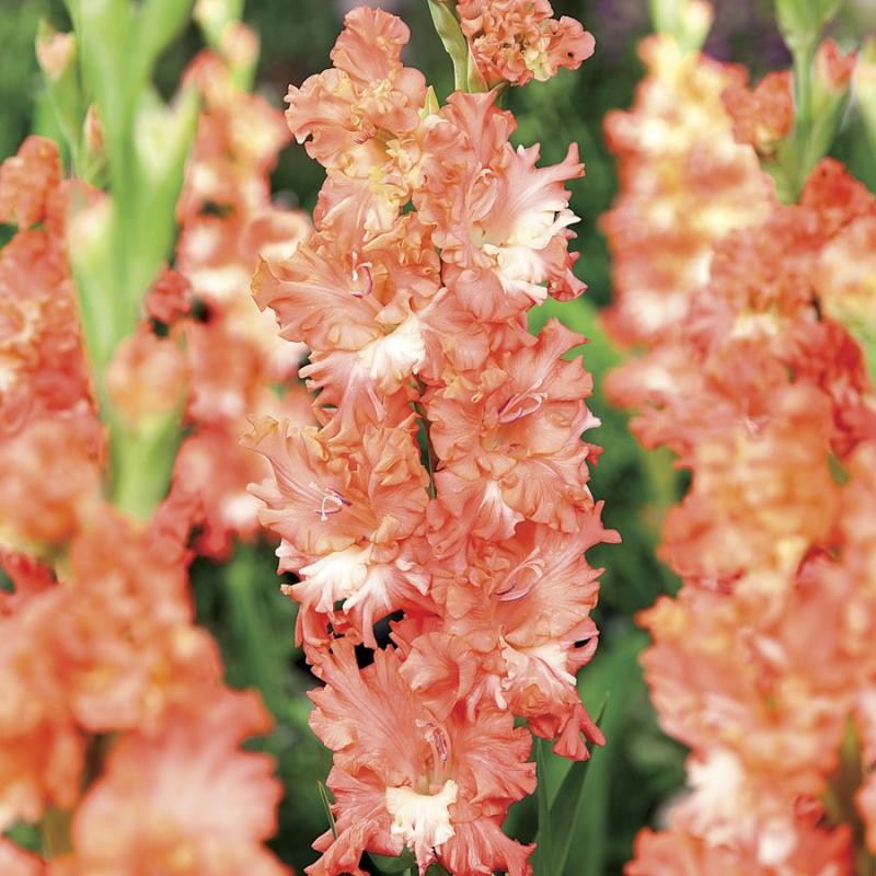 Луковицы гладиолуса гибридного Sunny Frizzles выращивают в открытом грунте на солнечных местах. К почве растение не требовательно. При общей высоте 130-150 см, длина колосовидного соцветия достигает 60-80 см. Бутоны плотно располагаются на цветоносе. Цветки крупные, сильно гофрированные. Основной цвет лепестков – лососевый, внутри бутончиков есть яркое молочно-белое пятно. Цветение продолжается с июля по сентябрь. Главное достоинство гладиолуса гибридного Sunny Frizzles – цветы не опадают даже от сильных дождей.