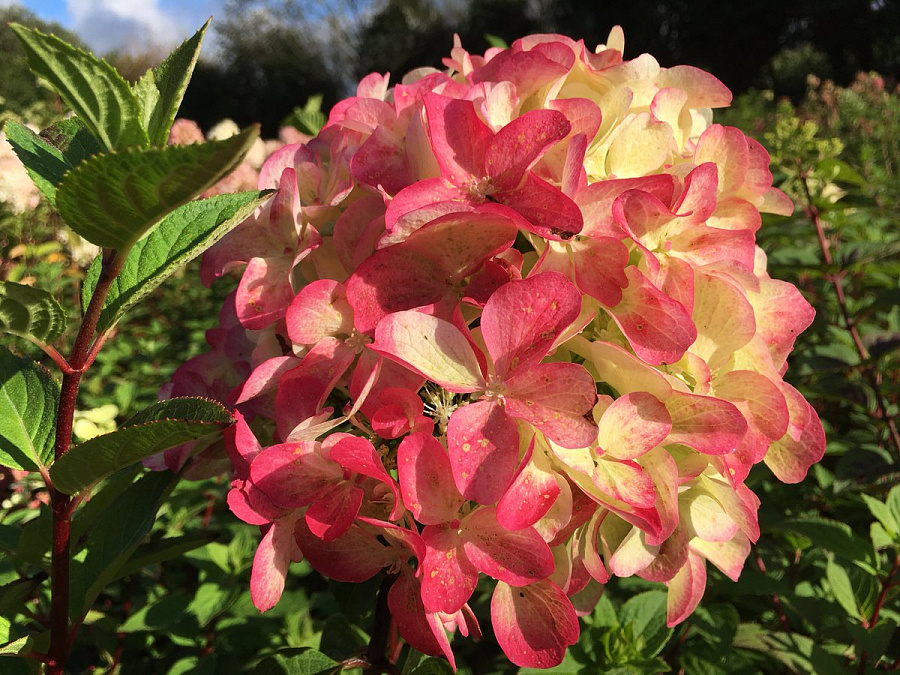 Саженцы гортензии метельчатой Граффити (Hydrangea paniculata Graffiti) – низкорослый сорт, украсят приусадебный участок крупными соцветиями с разноцветными цветочками. Высота взрослого растения не превышает одного метра, ширина – 1,1 метра. Листья овально-яйцевидной формы, окрашены в темно-зеленый цвет, осенью желтеют. Цветение – с июля до первых заморозков. Соцветия конические метельчатые, крупные – до 30 сантиметров в длину. Цветки стерильные, меняю окраску в процессе цветения от желто-зеленого до ярко-розовых с кремовыми полосками. Гортензия морозостойкая, но до достижения 3-х летнего возраста желательно укрывать на зимний период.