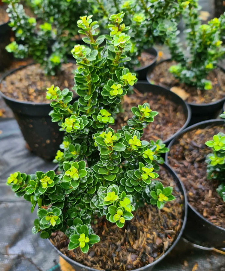 Саженцы Падуба японского остролистного Дварф Пагода (Dwarf Pagoda) – из-за небольшого размера относится к карликовым кустарникам. Ветви располагаются, густо образуя шаровидную крону. Растёт кустарник медленно, что позволяет применять его в любых композициях. Тёмно-зелёные листочки остаются на ветке на зимовку. В Осеннего период из маленьких белых цветочков появляются крошечные чёрные плоды. Максимальная высоты спустя 50 лет будет всего 90 сантиметров. Этот вид падуба не требователен, спокойно переносит загрязнённый городской воздух. Из-за скромных размеров можно выращивать дома, главное, чтобы место было прохладным.