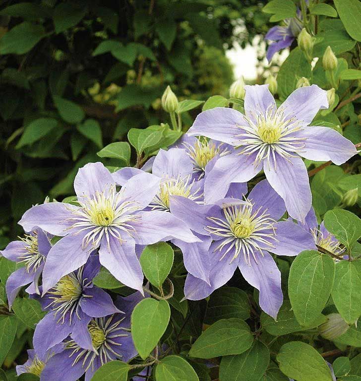 Клематис крупноцветковый Юста - это волшебное растение, способное преобразить ваш сад в настоящий райский уголок. Его крупные цветки светло-голубовато-розового оттенка будут радовать глаз в течение нескольких месяцев весной и летом. Листья клематиса зеленые весной и летом, а осенью приобретают желтый оттенок, создавая яркую палитру красок.