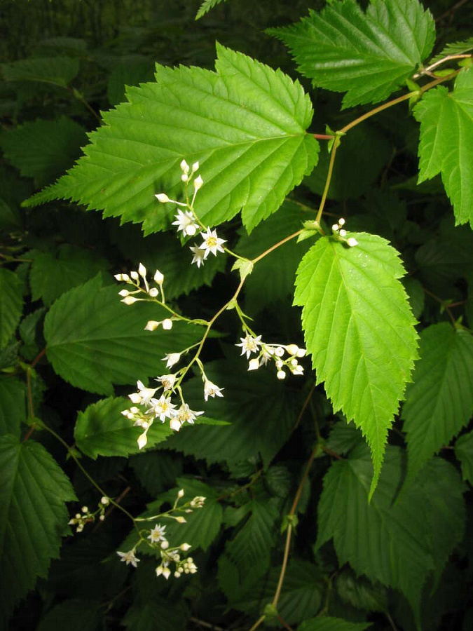 Саженцы стефанандры Танаки подарят саду высокорослый раскидистый кустарник с изящными листьями и воздушной кроной. Именно форма листьев и составляет основную декоративность кустарника. Основание листочка сердцевидное, а конец сильно заостренный, края крупнозубчатые. Поверхность самого листа выглядит морщинистой из-за глубоко вдавленных жилок. Осенью окраска разнообразна: от стандартных желтых до пурпурных и коричневых тонов. Мелкие белые цветочки собраны в метельчатые соцветия. Крупномеры позволят ощутить всю декоративность стефанандры Танаки уже сразу после посадки.